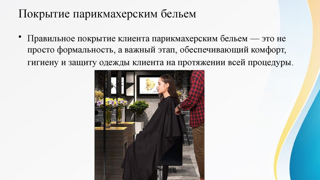 Покрытие парикмахерским бельем• Правильное покрытие клиента парикмахерским бельем — это не