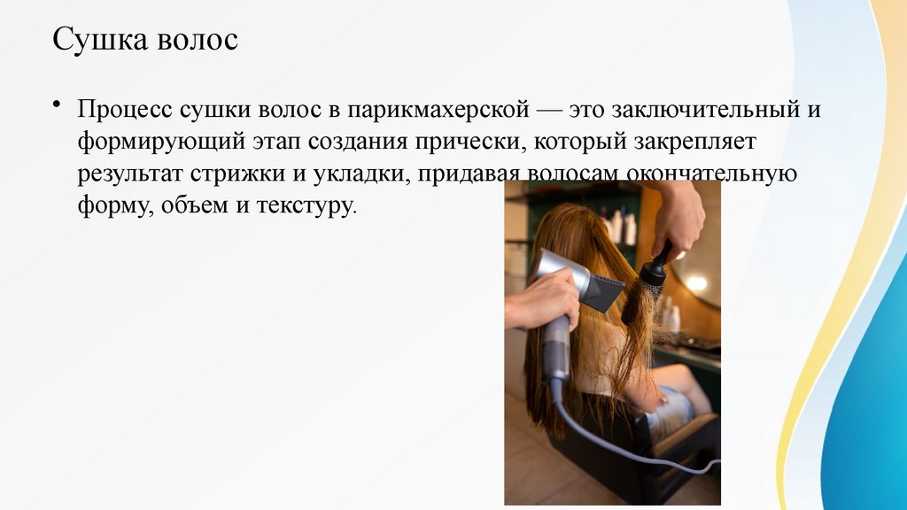 Сушка волос• Процесс сушки волос в парикмахерской — это заключительный и