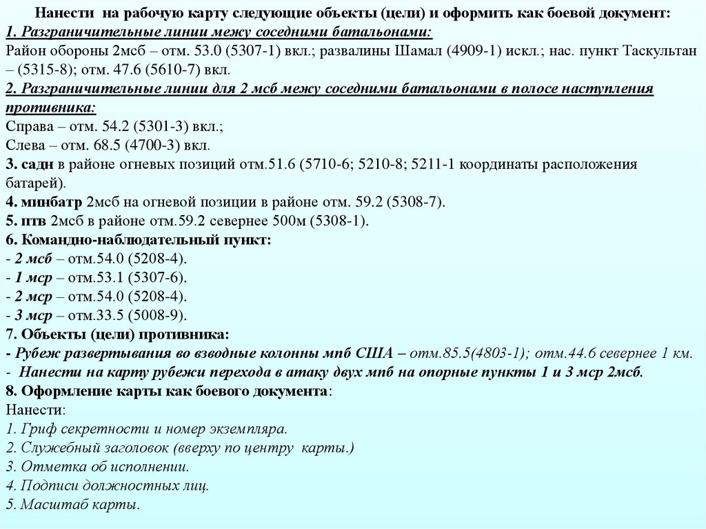 2 мсб, подготовил район обороны: отм. 53.0 (5307-1), развалины Шамал (4909-1), 700 м зап. отм. 51.6