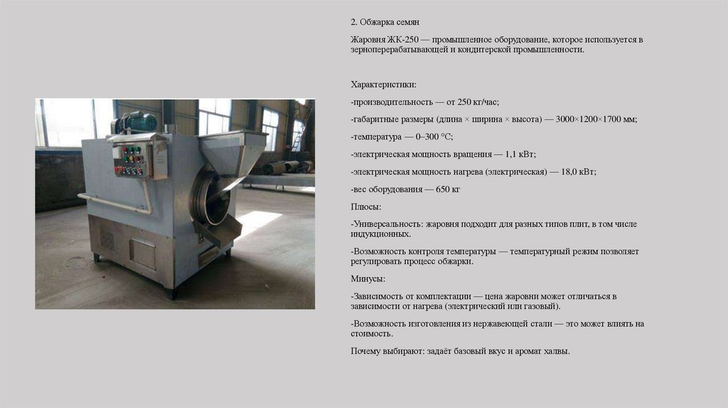 2. Обжарка семянЖаровня ЖК-250 — промышленное оборудование, которое используется в