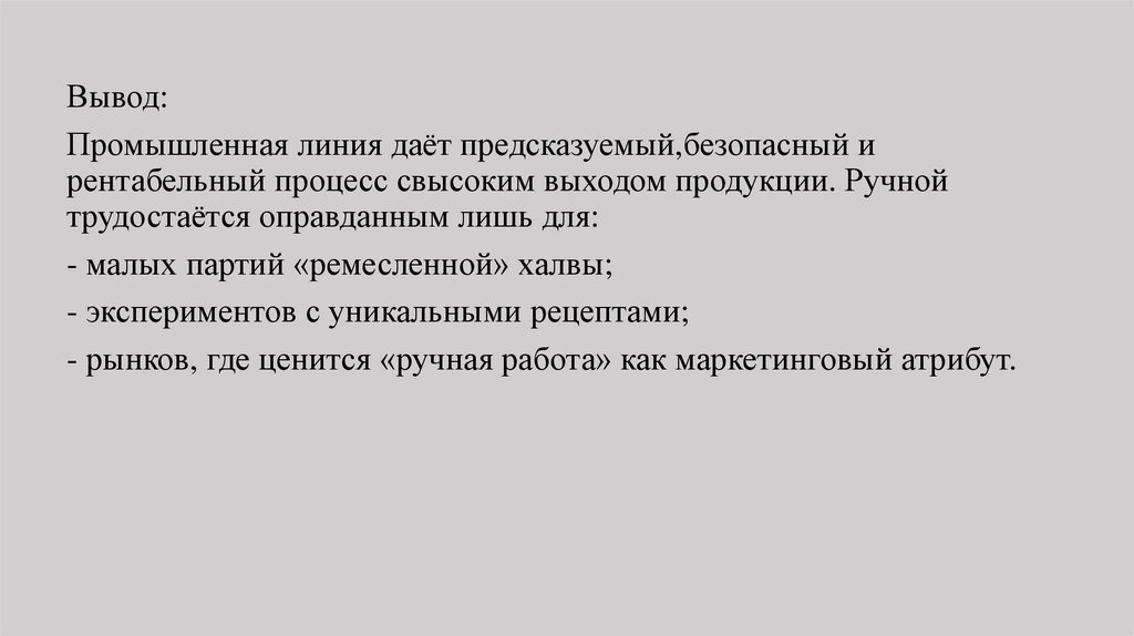 Вывод:Промышленная линия даёт предсказуемый,безопасный и