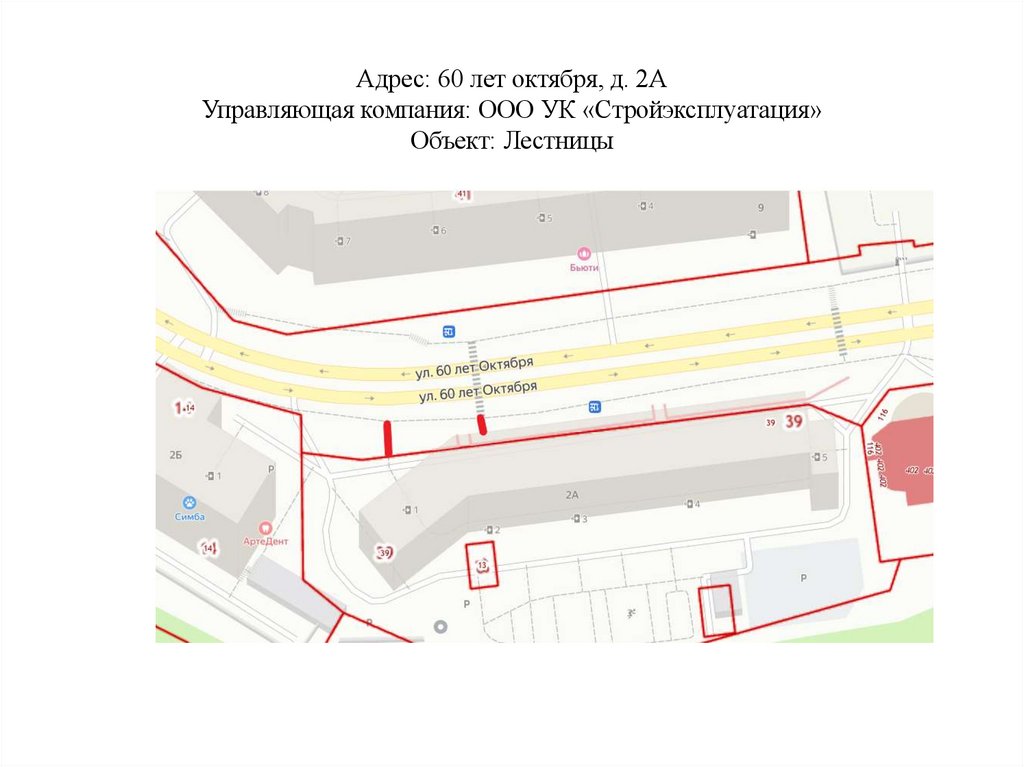 1. Адрес: 60 лет октября, д. 2А Управляющая компания: ООО УК «Стройэксплуатация» Объект: Лестницы