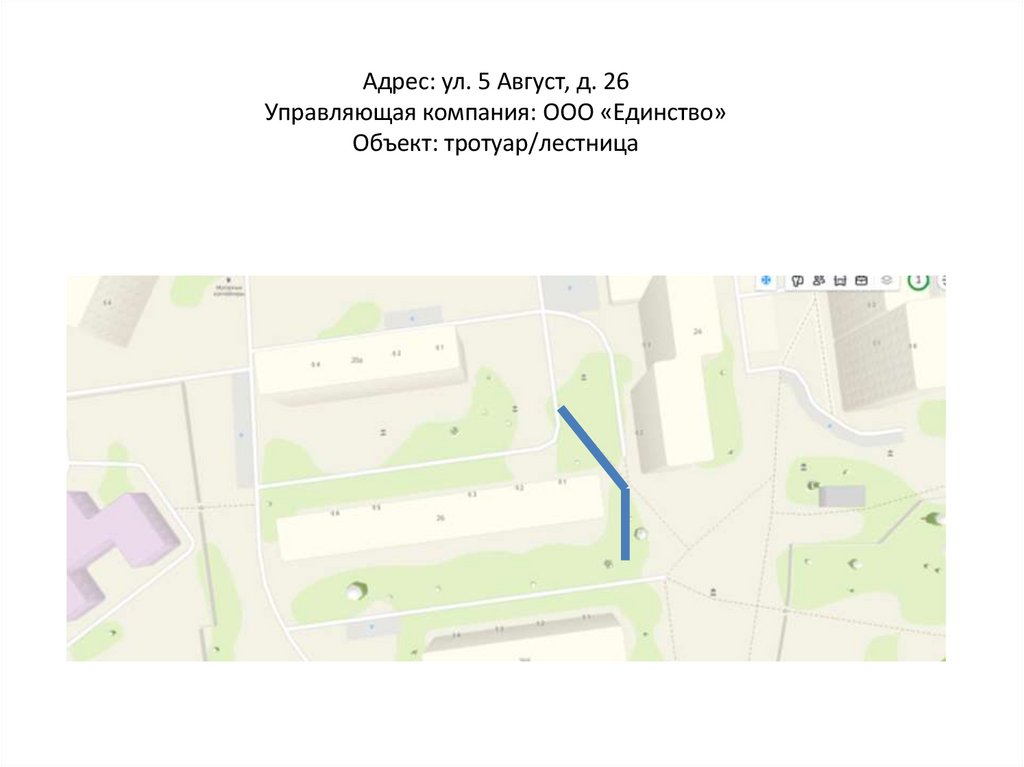 30. Адрес: ул. 5 Августа , д. 29А, 29Б, ул. Дегтярева, д. 14 Управляющая компания: ООО «УК Салют-16» Объект: тротуар/лестница