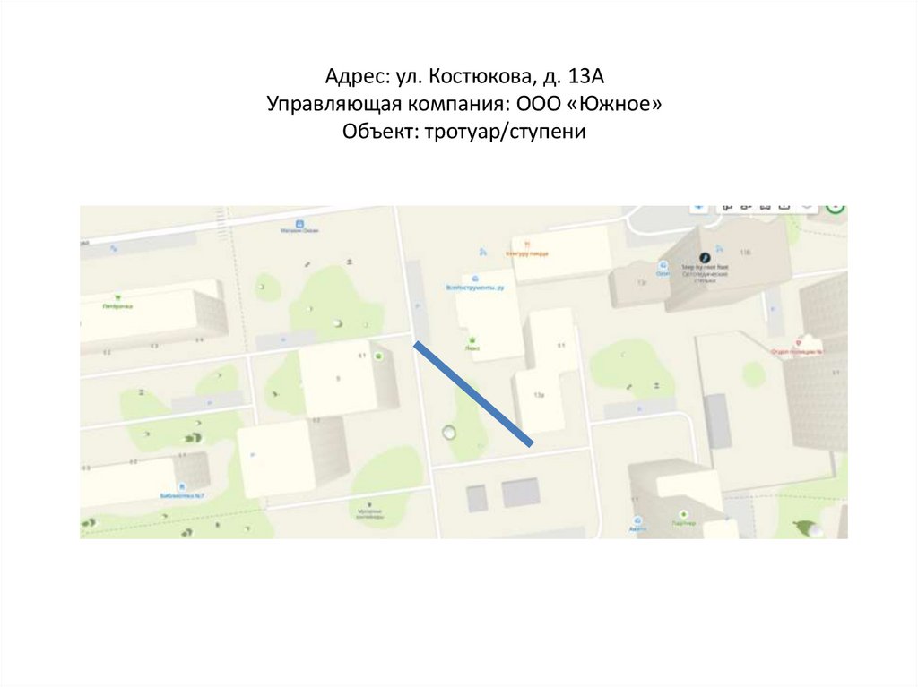 12. Адрес: ул. 60 лет Октября, 1 Управляющая компания: ООО «УК Стройэксплуатация» Объект: тротуар/лестничный марш