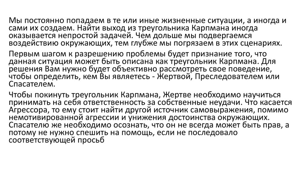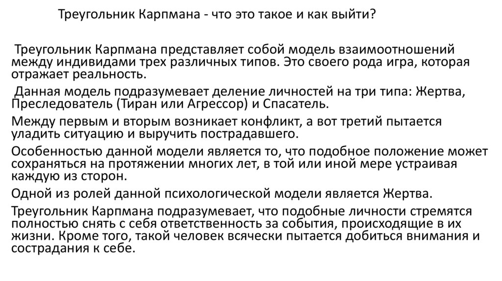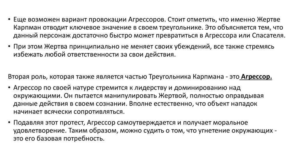 • Еще возможен вариант провокации Агрессоров. Стоит отметить, что именно ЖертвеКарпман отводит ключевое значение в своем треугольнике. Это объясняется тем, что