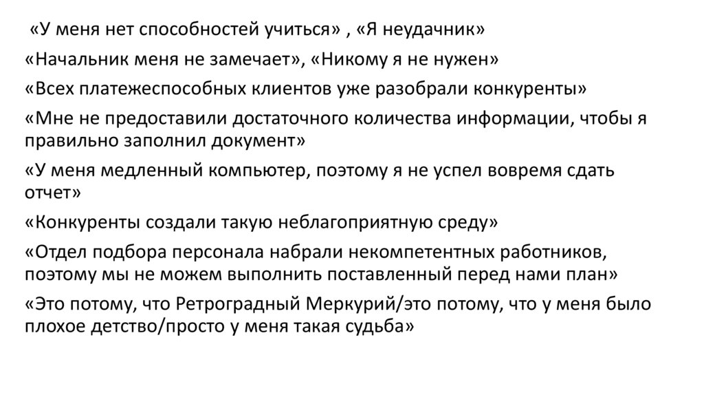 «У меня нет способностей учиться» , «Я неудачник»«Начальник меня не замечает», «Никому я не нужен»