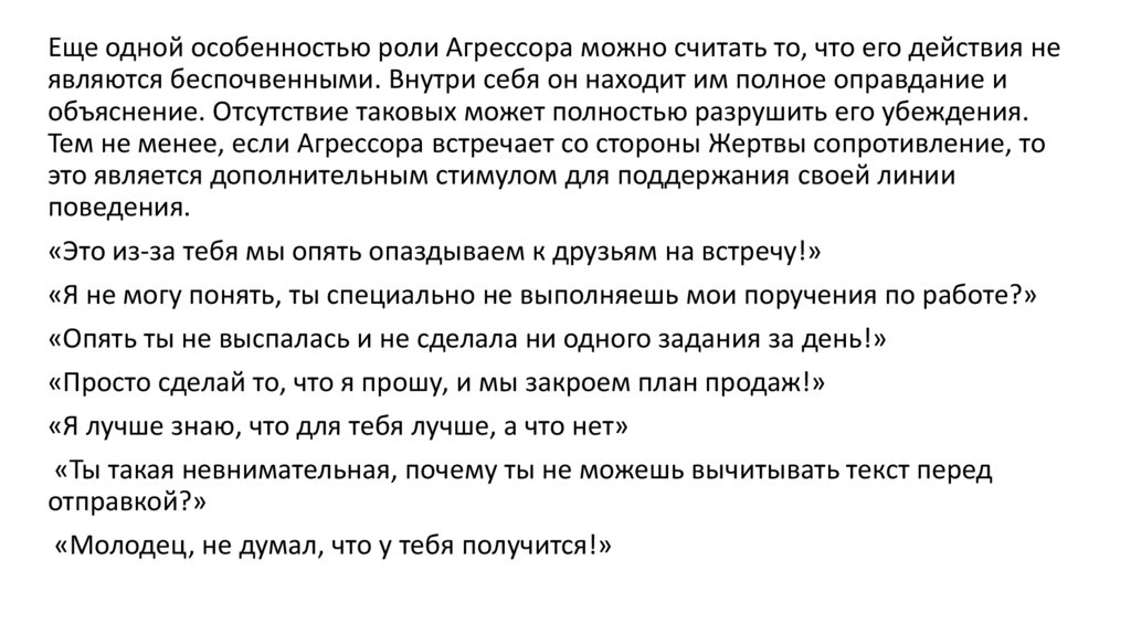 Еще одной особенностью роли Агрессора можно считать то, что его действия неявляются беспочвенными. Внутри себя он находит им полное оправдание и