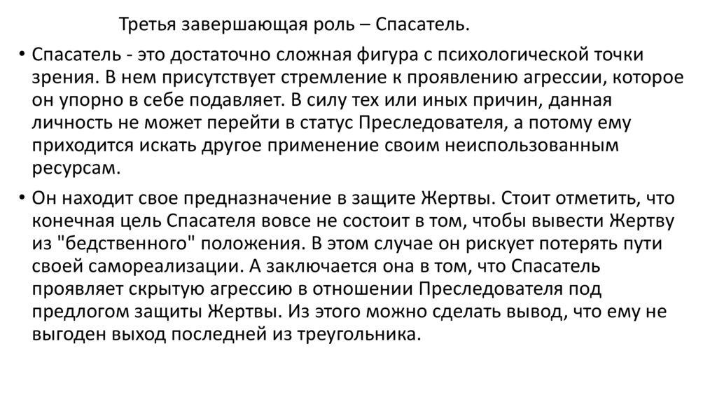 Третья завершающая роль – Спасатель.• Спасатель - это достаточно сложная фигура с психологической точки