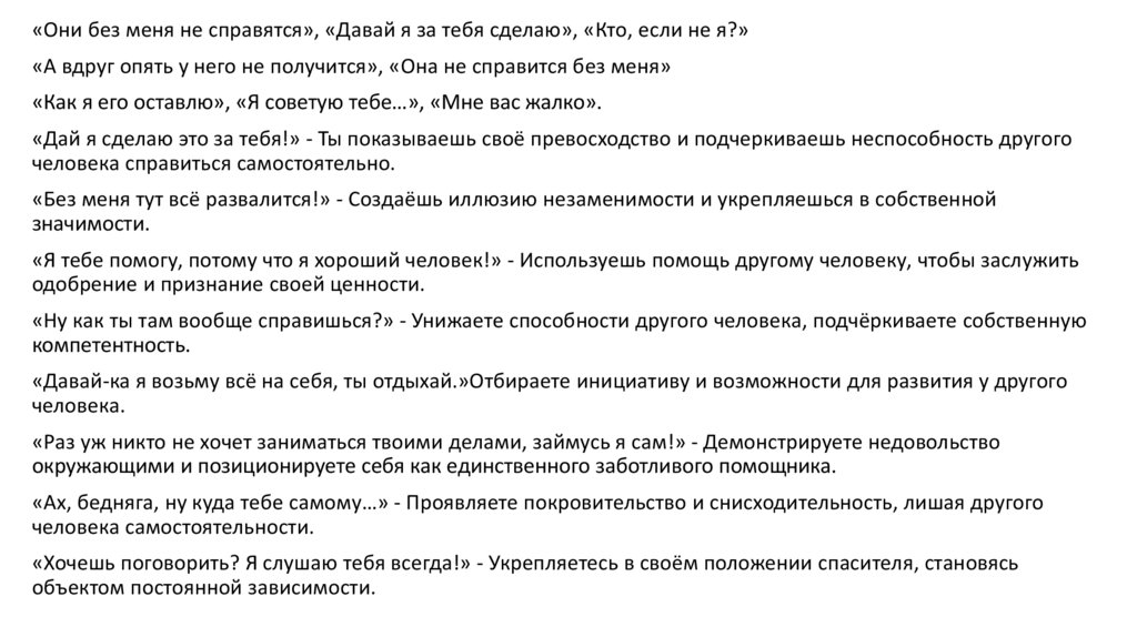 «Они без меня не справятся», «Давай я за тебя сделаю», «Кто, если не я?»«А вдруг опять у него не получится», «Она не справится без меня»