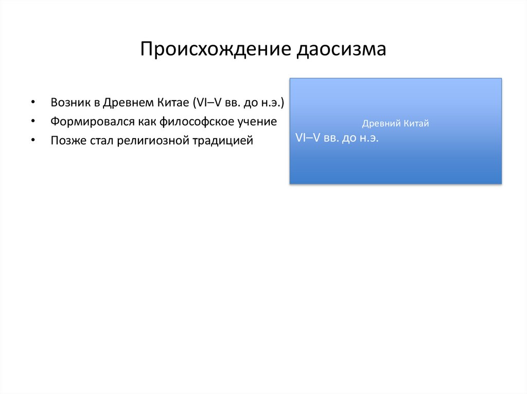 Происхождение даосизмаВозник в Древнем Китае (VI–V вв. до н.э.)