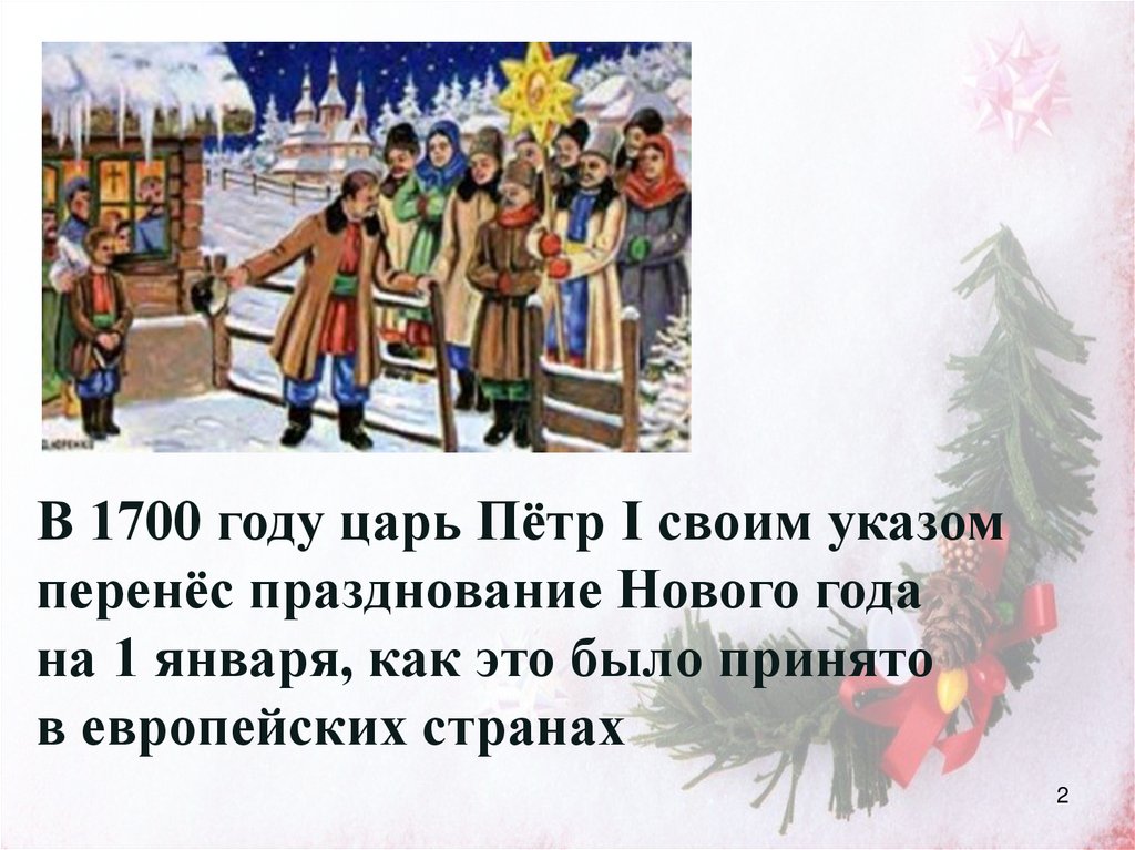 В 1700 году царь Пётр I своим указомперенёс празднование Нового года