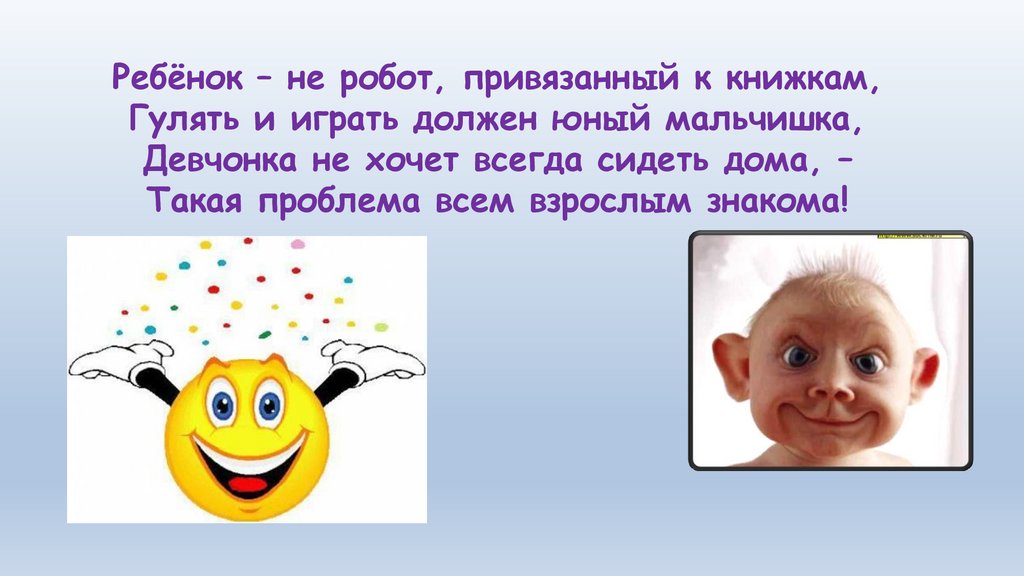 Ребёнок – не робот, привязанный к книжкам,Гулять и играть должен юный мальчишка,