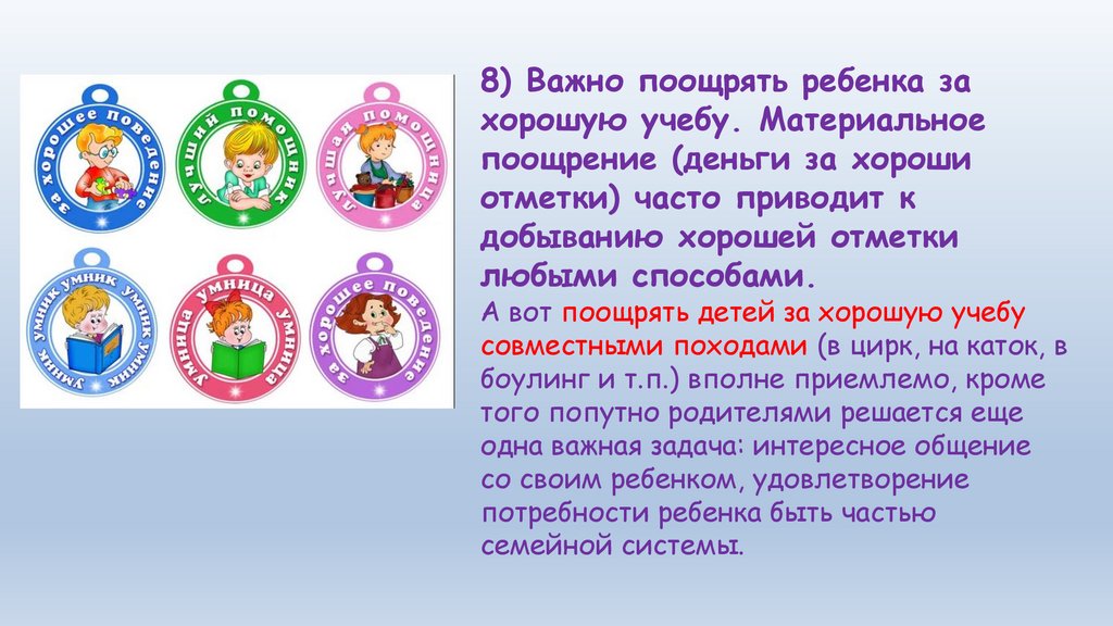 8) Важно поощрять ребенка захорошую учебу. Материальное