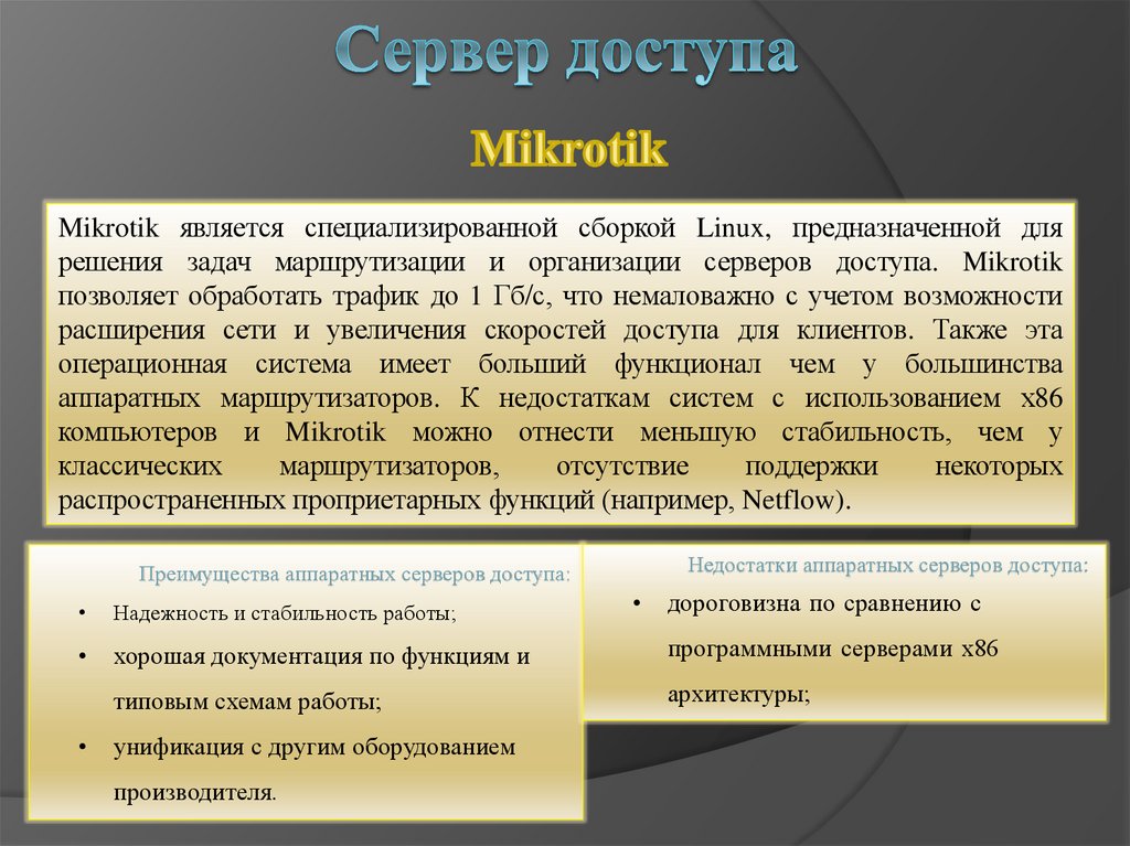 Mikrotik является специализированной сборкой Linux, предназначенной длярешения задач маршрутизации и организации серверов доступа. Mikrotik