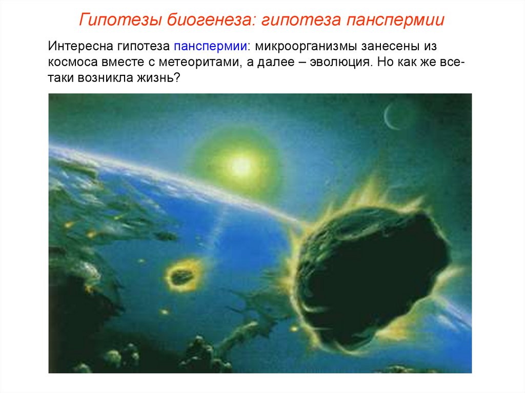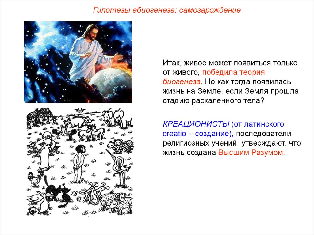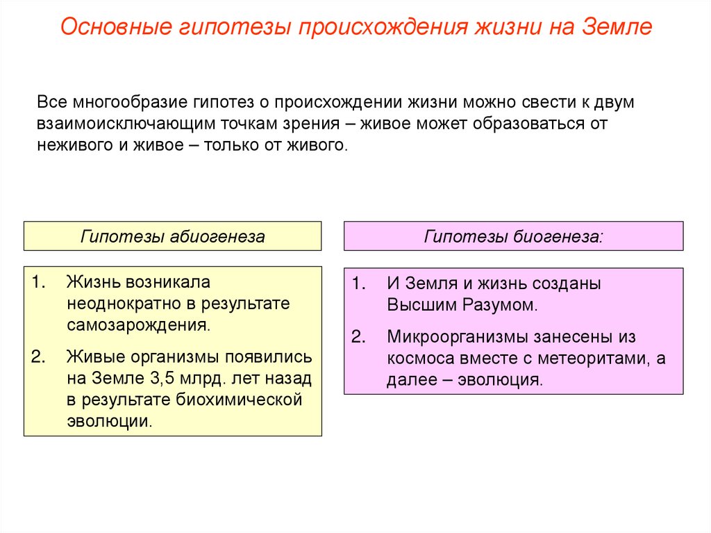 Основные гипотезы происхождения жизни на ЗемлеВсе многообразие гипотез о происхождении жизни можно свести к двум