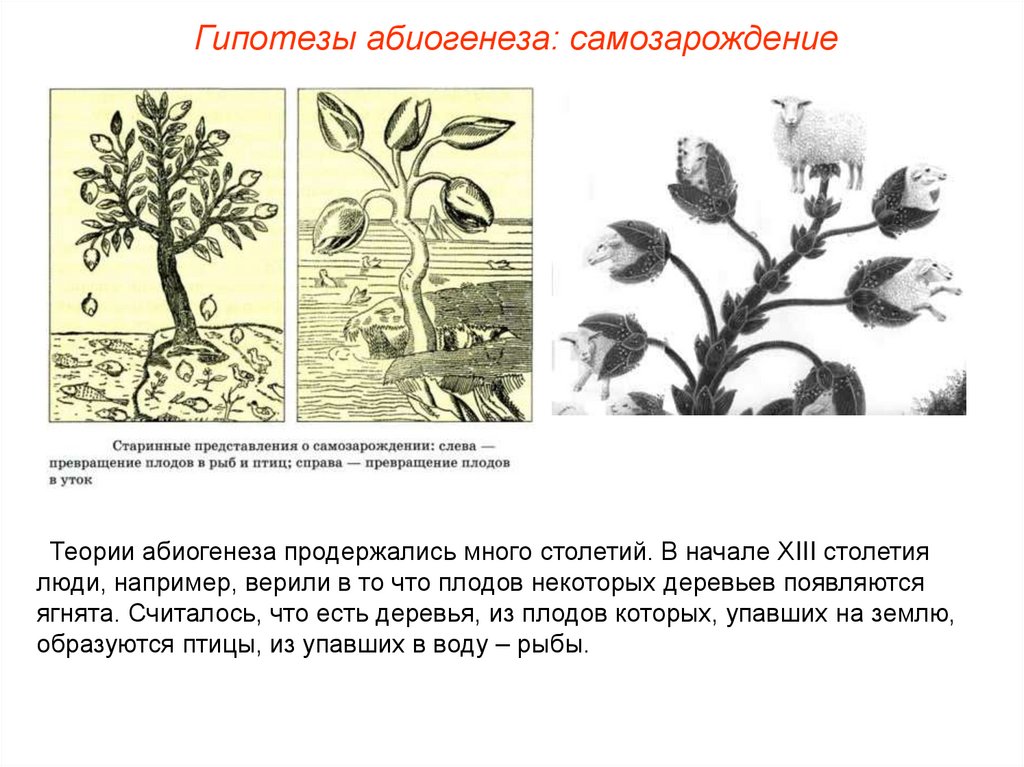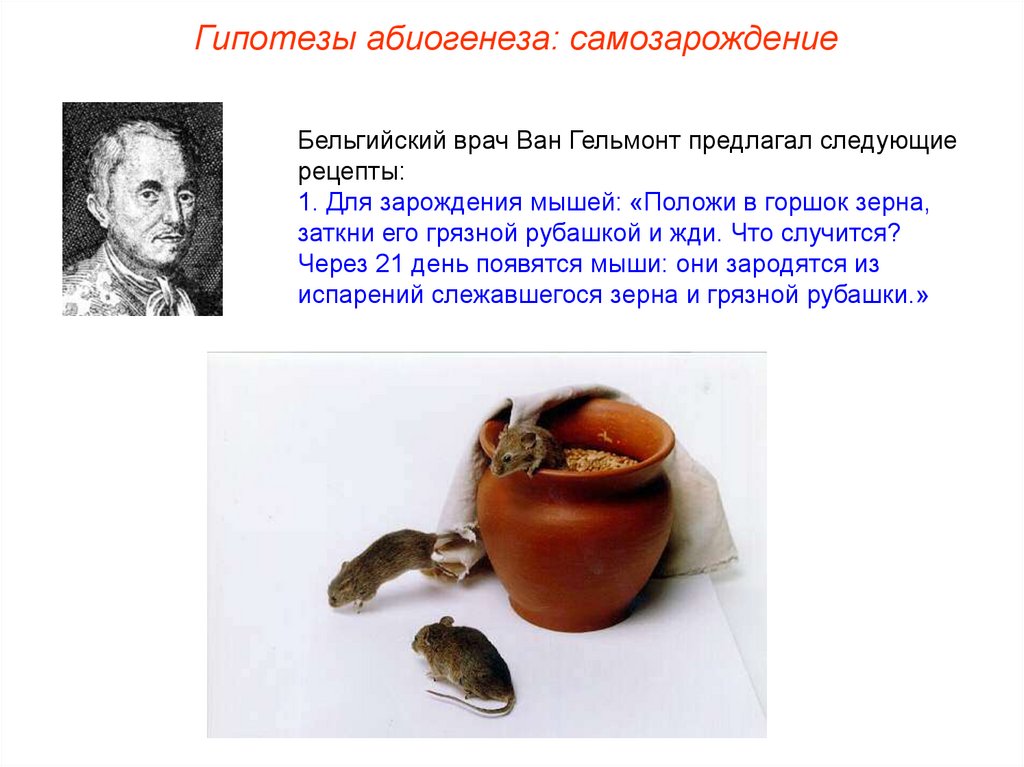 Гипотезы абиогенеза: самозарождениеТеории абиогенеза продержались много столетий. В начале ХIII столетия