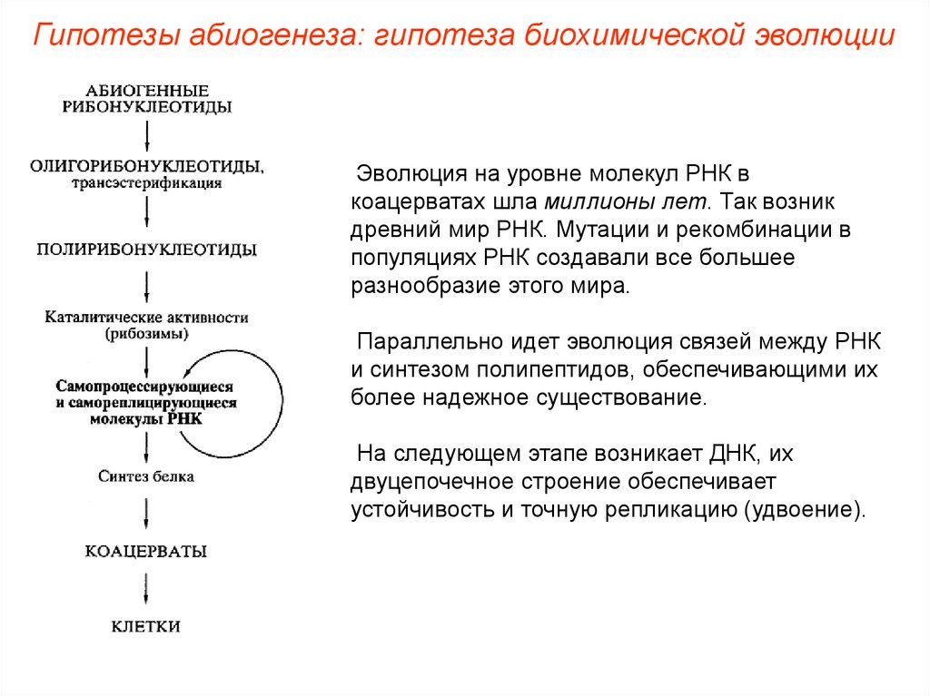 Гипотезы абиогенеза: гипотеза биохимической эволюцииЭволюция на уровне молекул РНК в