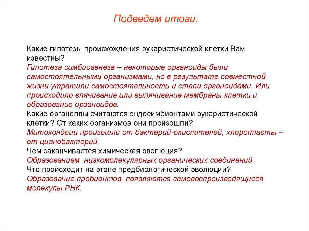 Подведем итоги:Какие гипотезы происхождения эукариотической клетки Вам