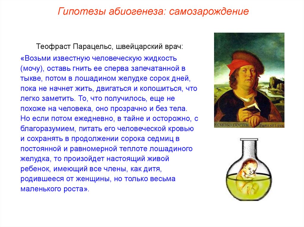 Гипотезы абиогенеза: самозарождениеТеофраст Парацельс, швейцарский врач: