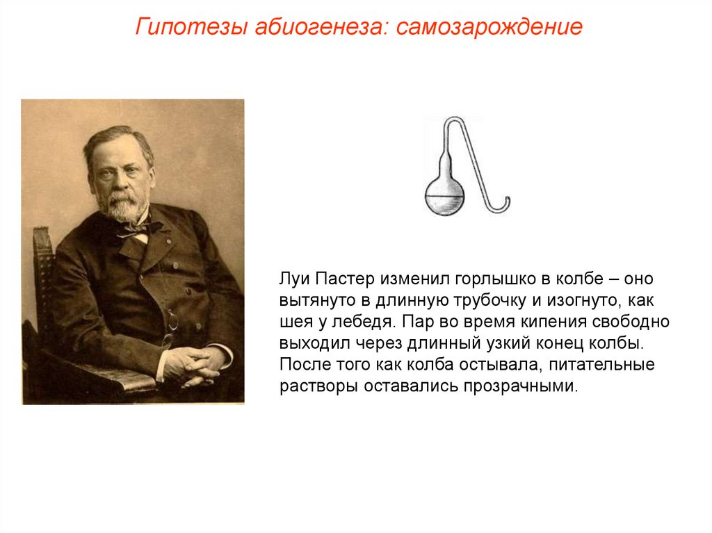 Гипотезы абиогенеза: самозарождениеЛуи Пастер изменил горлышко в колбе – оно