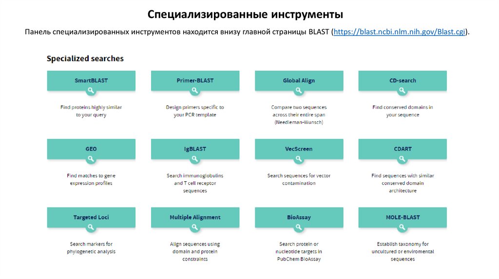 Специализированные инструментыПанель специализированных инструментов находится внизу главной страницы BLAST (https://blast.ncbi.nlm.nih.gov/Blast.cgi).