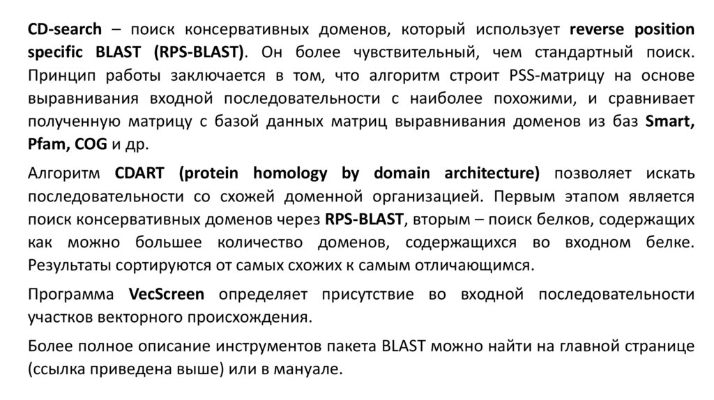 CD-search – поиск консервативных доменов, который использует reverse positionspecific BLAST (RPS-BLAST). Он более чувствительный, чем стандартный поиск.