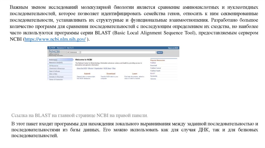 часто используются программы серии BLAST (Basic Local Alignment Sequence Tool), предоставляемым сервером