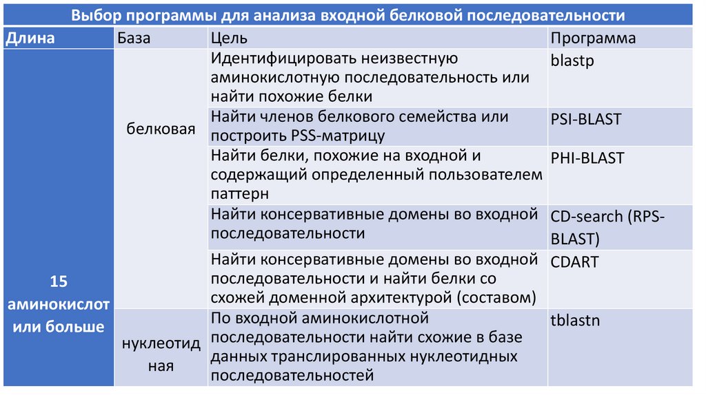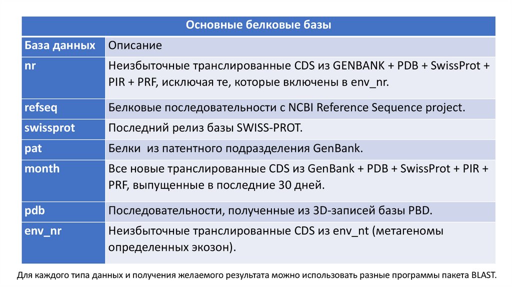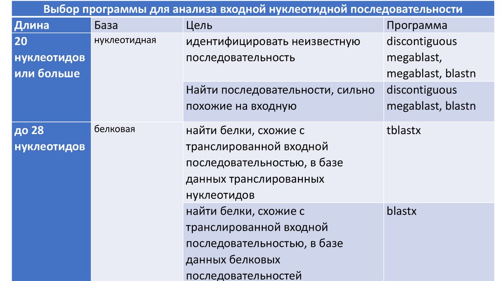 Для каждого типа данных и получения желаемого результата можно использовать разные программы пакета BLAST.