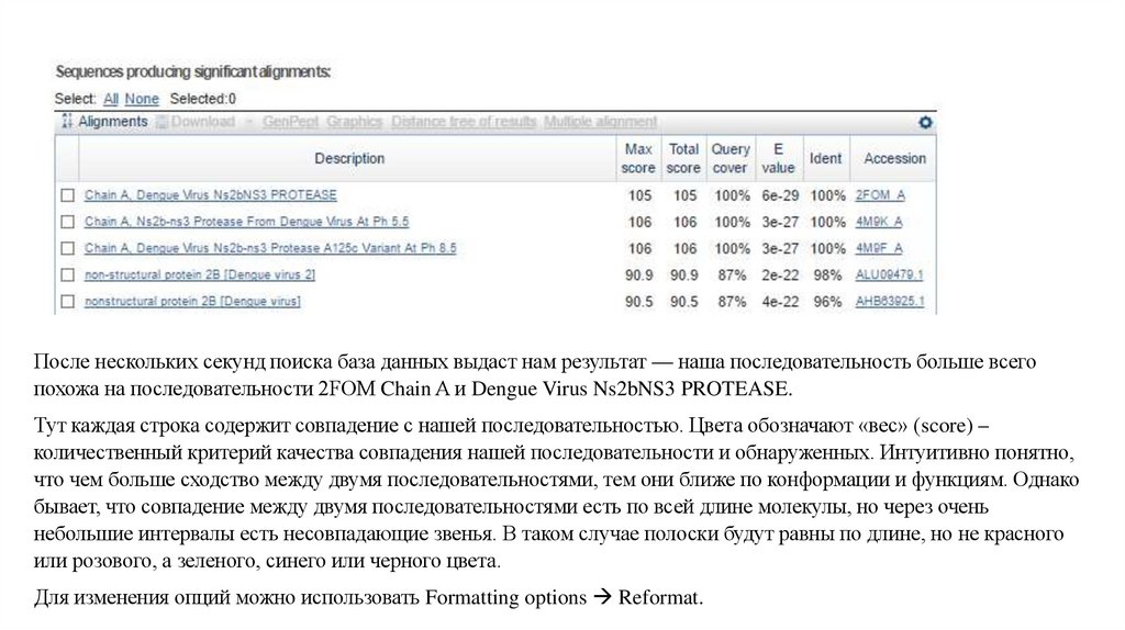 После нескольких секунд поиска база данных выдаст нам результат — наша последовательность больше всегопохожа на последовательности 2FOM Chain A и Dengue Virus Ns2bNS3 PROTEASE.