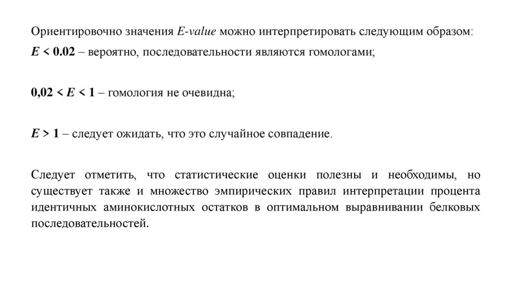 Ориентировочно значения E-value можно интерпретировать следующим образом:Е < 0.02 – вероятно, последовательности являются гомологами;