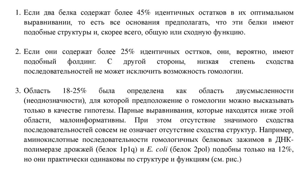 1. Если два белка содержат более 45% идентичных остатков в их оптимальномвыравнивании, то есть все основания предполагать, что эти белки имеют