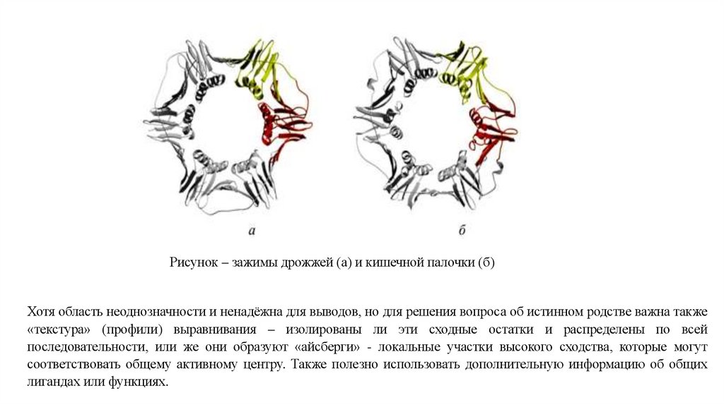 Рисунок – зажимы дрожжей (а) и кишечной палочки (б)Хотя область неоднозначности и ненадёжна для выводов, но для решения вопроса об истинном родстве важна также