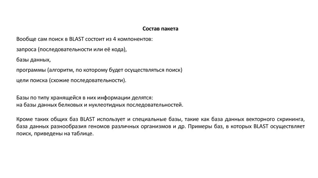 Состав пакетаВообще сам поиск в BLAST состоит из 4 компонентов: