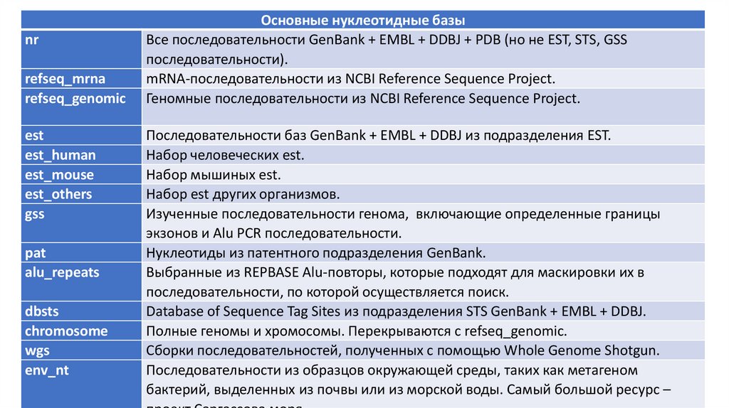 Типы баз данных (последовательностей нуклеиновых кислот, последовательностей генов, аминокислотных