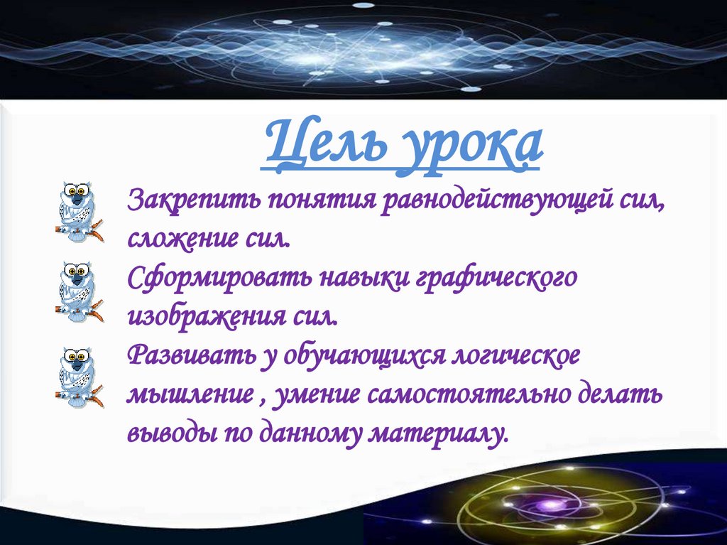 Цель урокаЗакрепить понятия равнодействующей сил,