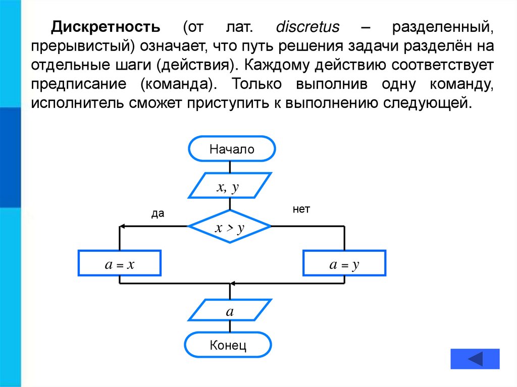 Дискретность (от лат. discretus – разделенный,прерывистый) означает, что путь решения задачи разделён на