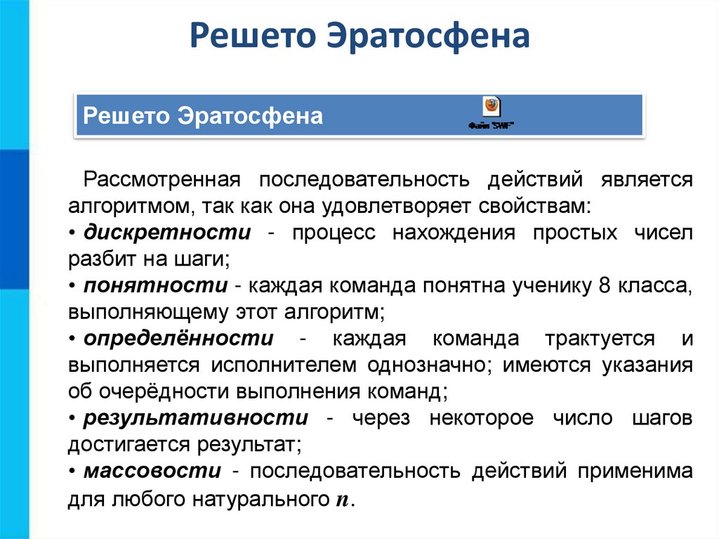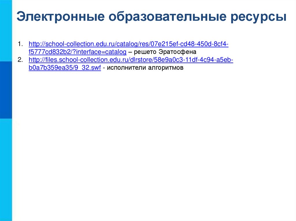 Электронные образовательные ресурсы1. http://school-collection.edu.ru/catalog/res/07e215ef-cd48-450d-8cf4f5777cd832b2/?interface=catalog – решето Эратосфена