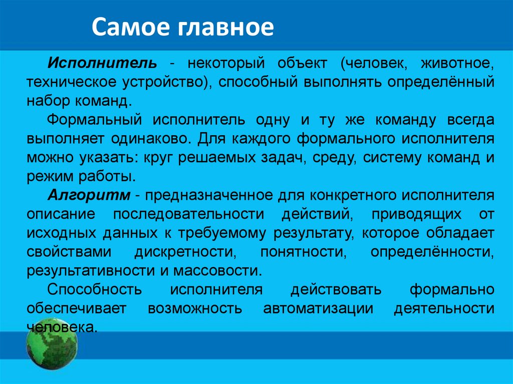 Исполнитель алгоритмаИсполнитель - это некоторый объект (человек, животное,