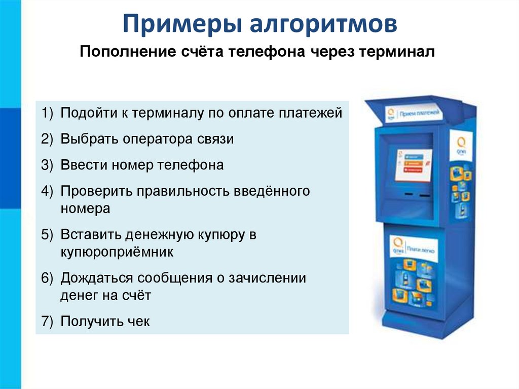 Примеры алгоритмовПополнение счёта телефона через терминал