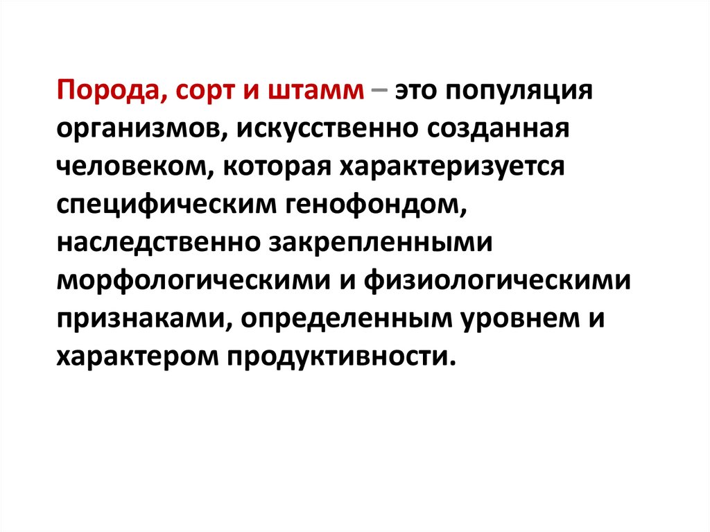 Порода, сорт и штамм – это популяцияорганизмов, искусственно созданная