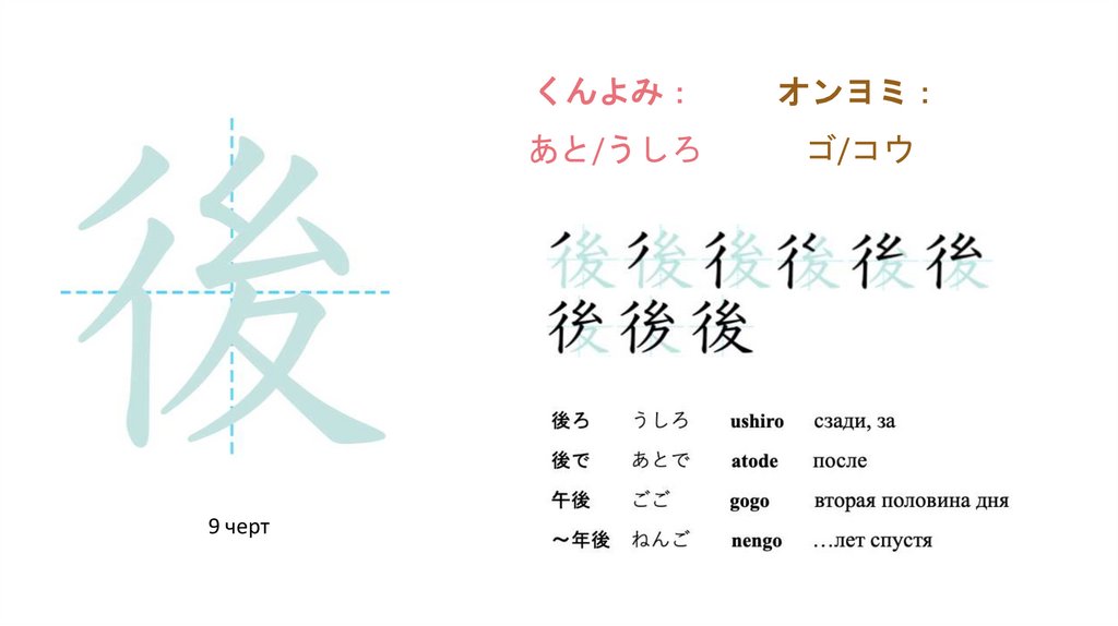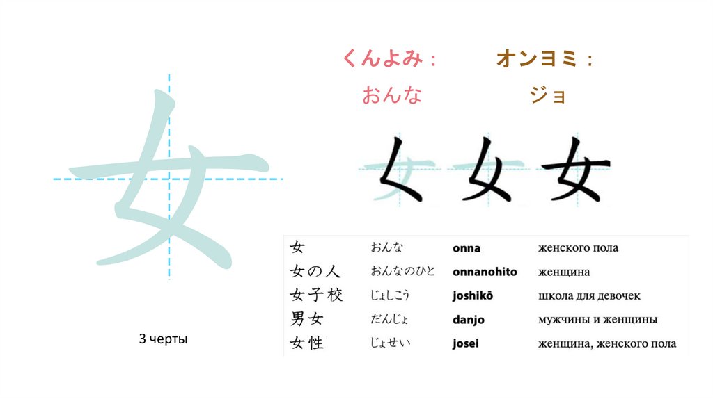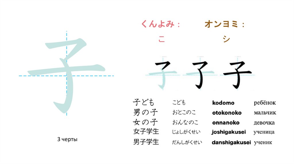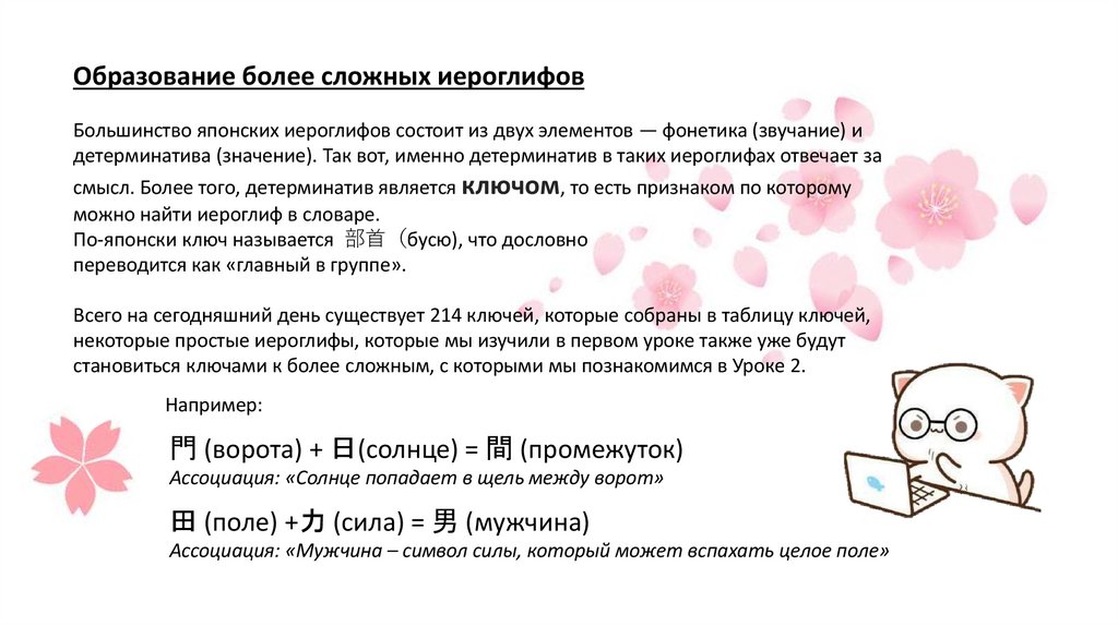 Образование более сложных иероглифовБольшинство японских иероглифов состоит из двух элементов — фонетика (звучание) и