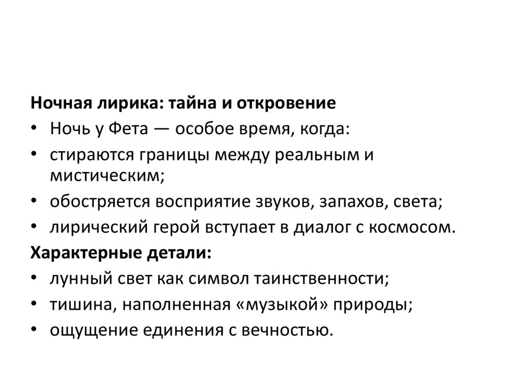 Ночная лирика: тайна и откровение• Ночь у Фета — особое время, когда:
