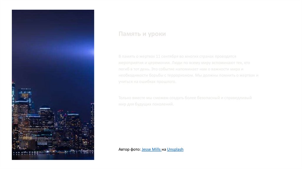 Память и урокиВ память о жертвах 11 сентября во многих странах проводятся