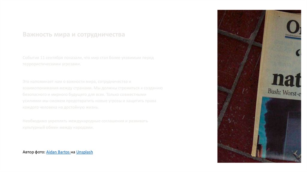 Важность мира и сотрудничестваСобытия 11 сентября показали, что мир стал более уязвимым перед