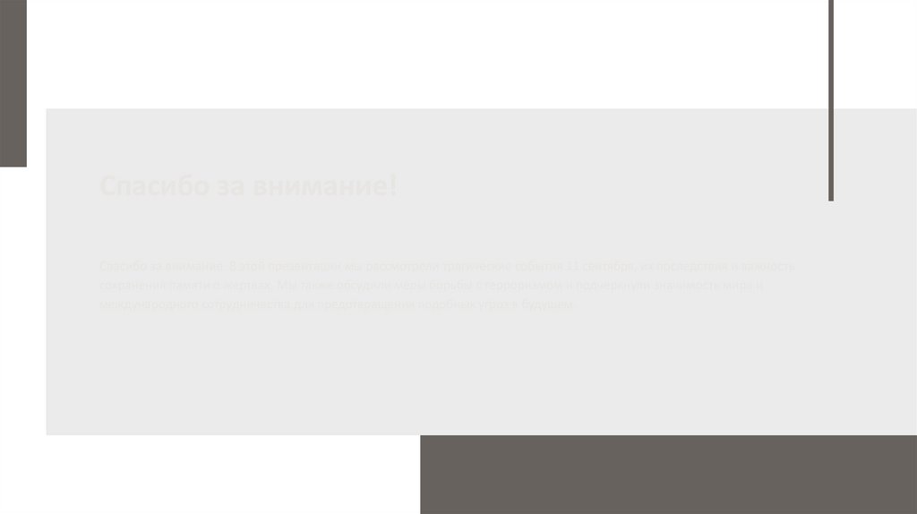 Спасибо за внимание!Спасибо за внимание. В этой презентации мы рассмотрели трагические события 11 сентября, их последствия и важность
