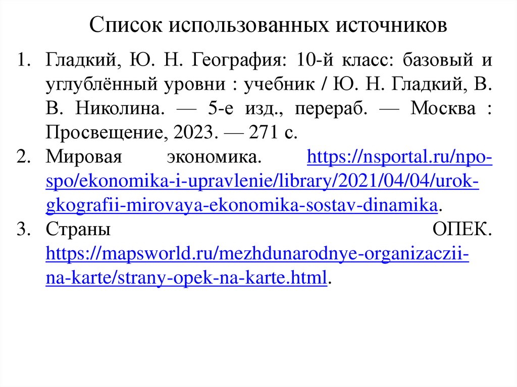 Список использованных источников1. Гладкий, Ю. Н. География: 10-й класс: базовый и