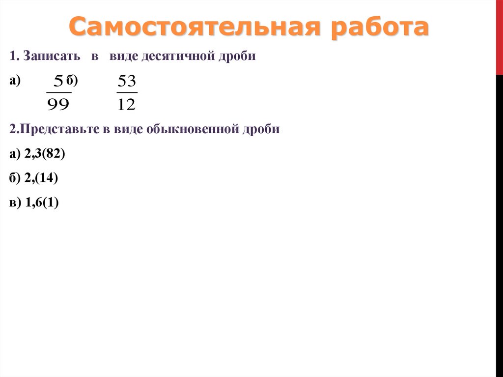 Самостоятельная работа1. Записать в виде десятичной дроби