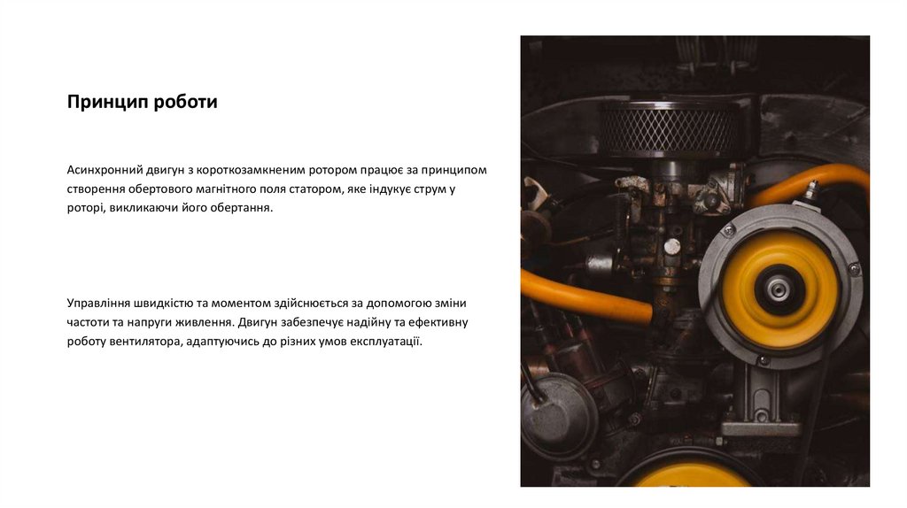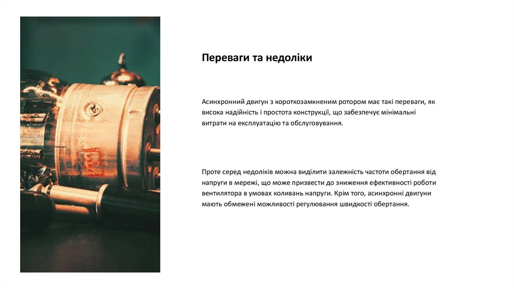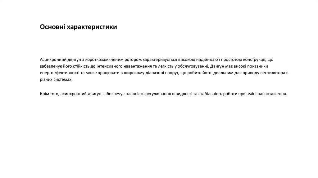 Крім того, асинхронний двигун забезпечує плавність регулювання швидкості та стабільність роботи при зміні навантаження.