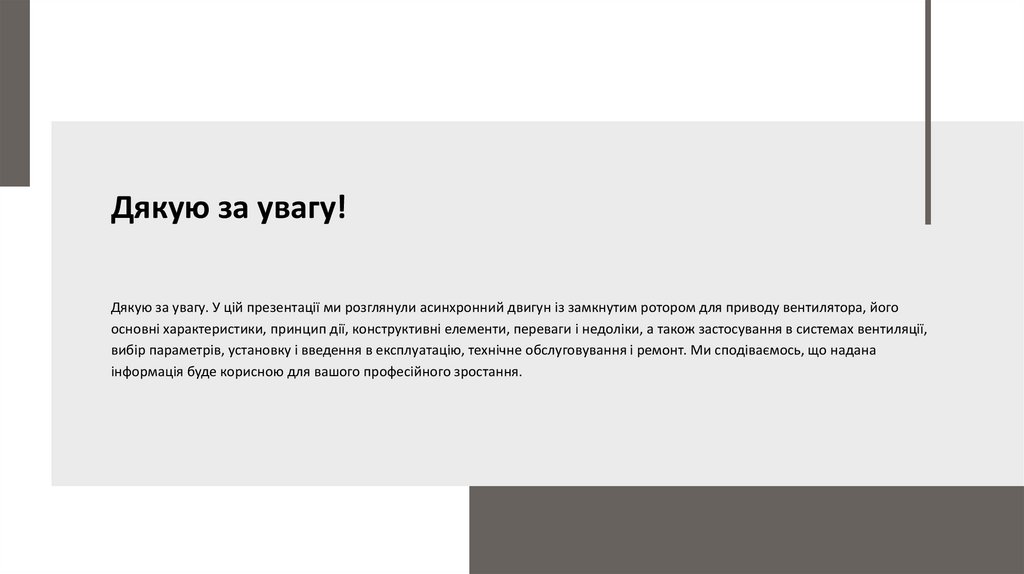 Дякую за увагу!Дякую за увагу. У цій презентації ми розглянули асинхронний двигун із замкнутим ротором для приводу вентилятора, його