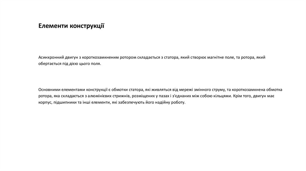 Елементи конструкціїАсинхронний двигун з короткозамкненим ротором складається з статора, який створює магнітне поле, та ротора, який